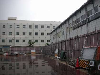 左側が南館建築現場、右側が仮設校舎です。真ん中には、きれいに整理整頓された作業場が広がっています。