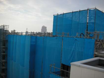 下は、南館の上層階の写真です。ブルーシートに覆われているので、外観はよくわかりません。しかし、日々、校舎内の作業が行われています。すでに窓枠等が設置されたところがあります。
