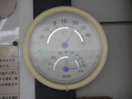 午前7時現在の温度計です。 気温25度で、湿度は95パーセントを超えています。 本当に蒸し暑いです。