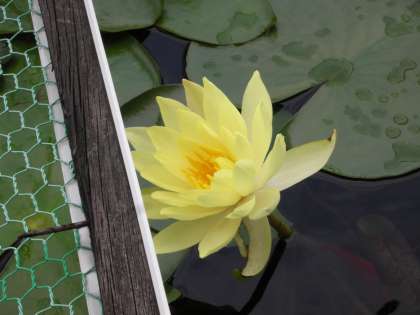 池の表面にハスの葉が浮かんでいますが。今朝見ると、きれいなハスの花が咲いていました。黄色い花です。きれいですね。