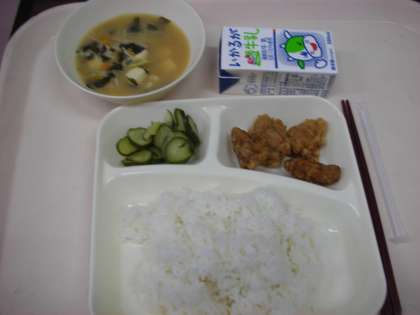 昨日は、豚肉の香味あげ、キュウリの甘酢づけ、味噌汁、米飯、牛乳でした。