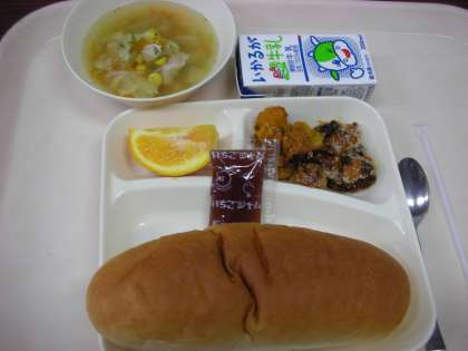 本日は、カボチャのミートグラタン、スープ、オレンジ、牛乳、パンそしてイチゴジャムが添えられています。