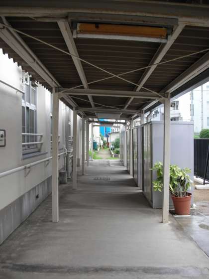 正門付近から見た、西館西側の廊下の様子です。 右側にプレハブの倉庫、奥には、ボランティア部の畑が見えます。