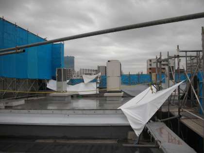 いつの間にか、空調の室外機が設置されています。ブルーシートでおおわれていますが、どんどん工事は進んでいます。