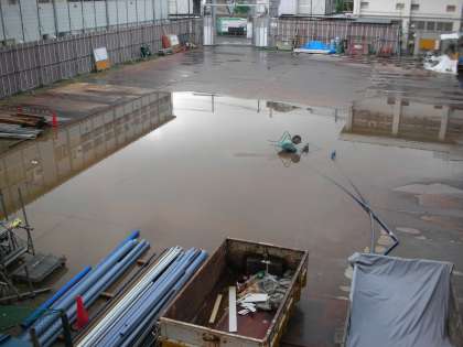 工事現場に、大きな水たまりができています。短時間に降った雨ですが、水たまりの大きさから、雨の降り方の激しさがわかりますね。