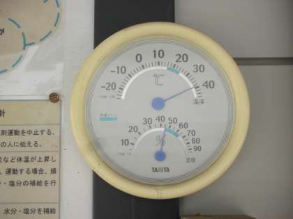 気温39.5度、湿度45パーセントを示しています。仮設校舎の屋根が陽光のおかげで焼けるように熱くなっているのでしょう。気温は高めに表示されます。