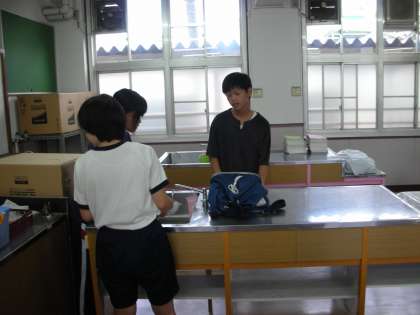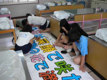 昨日に引き続き、ハンドクラフト部と生徒会役員が横断幕の作製に取り組んでいます。