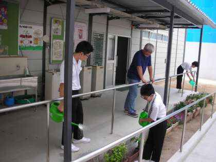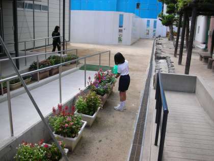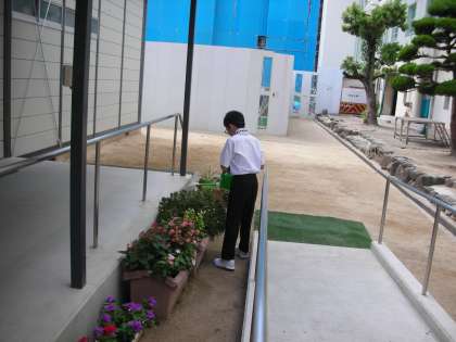 ボランティア部の人たちが、植物にお水をあげています。ていねいにプランターのお花に水をあげています。