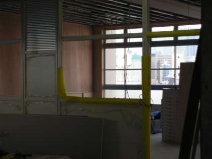 エレベーターホールから見た新南館の教室の写真です。壁板が打ち付けられています。