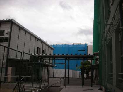 下は、仮説校舎です。仮設校舎は、見た目以上にしっかりとしています。あともう少しこの校舎で生活します。
