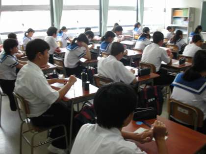 2年生の家庭科の授業です。夏休みの課題を集めています。