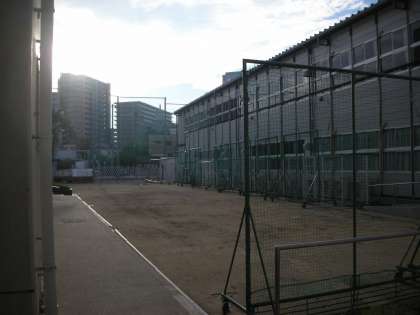 上は、体育館前から見たグラウンドと仮設校舎です。今日もまぶしい陽光が照りつけるのでしょう。