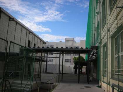 下は、新校舎を見た写真です。青空の下にきれいな校舎が良く見えます。