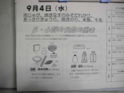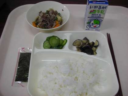 本日は、肉じゃが、焼きナスのみそだれかけ、あっさりきゅうり、ご飯、牛乳そして焼き海苔が添えられている。