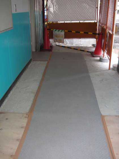 工事のためコンクリートが削られています(ガタガタと段差があります。)。段差が少しでも解消できるように、応急処置がされています。
