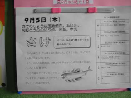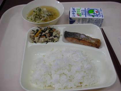本日は、鮭のしょうゆ風味焼き、五目汁、高野豆腐のいり煮、ご飯、牛乳でした。
