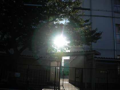 桜の枝の間から、まぶしい光が地面を照らしています。気を付けて過ごしましょう。