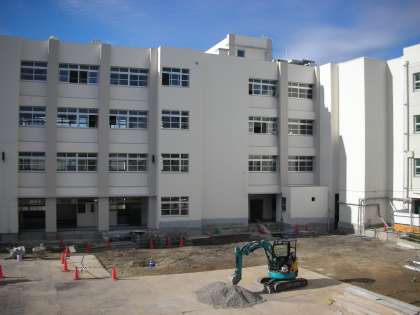 仮設校舎2階の校長室から見た新校舎です。