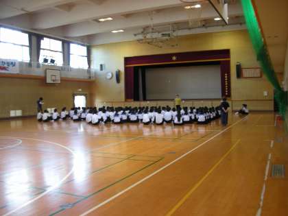 体育館では、1年生の学年集会が始まろうとしています。 毎週火曜日には、1年生の学年集会が行われます。