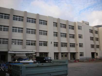 新校舎の写真です。 工事現場への入り口ゲートから撮影したものです。 新校舎が堂々とした姿を示しています。