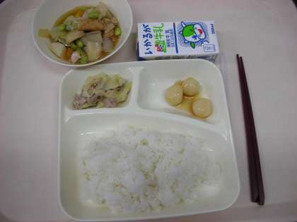 昨日は、鶏肉とさといもの煮物、豚肉とキャベツのいためもの、みたらしだんご、ご飯、牛乳でした。