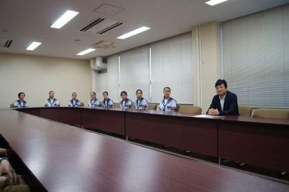 音楽部の16名と顧問の屋島先生、龍田先生が都島区役所を訪問しました。大畑区長とお会いし、コンクールの報告をしました。