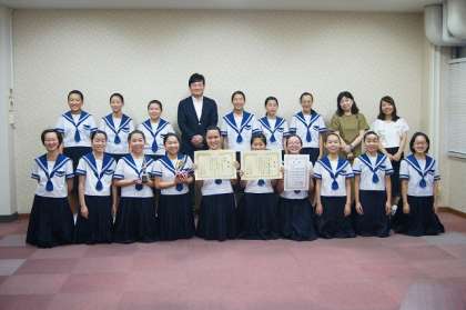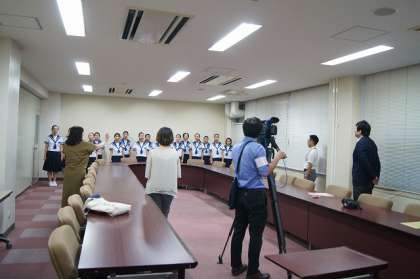 区長さんと記念撮影をした後、音楽部のメンバーが歌を披露しました。カメラマンさんもしっかりと撮影していました。