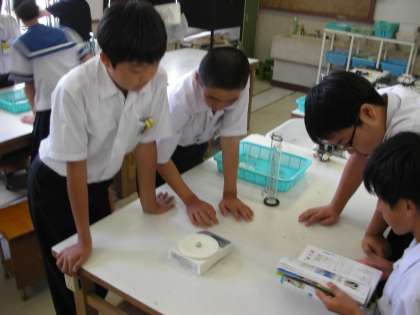 メスリンダーのメモリの読み方が生徒には困難なようです。目の高さをメスシリンダーの真横から水面の高さと同じ位置にしなければ正確な値が読み取れません。