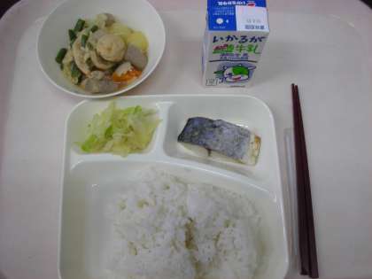 本日は、さごしの塩焼き、じゃがいもと一口がんもの煮物、キャベツのおひたし、ごはん、牛乳です。