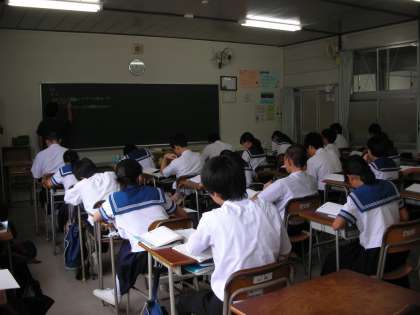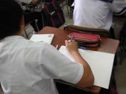 一次関数の練習問題に取り組んでいました。生徒たちは真剣に考えながらも、時折先生がお話される冗談に明るく反応したり、とてもほのぼのとした授業風景でした。