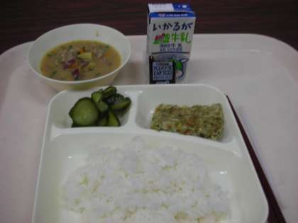 本日は、お好み焼き、豚汁、キュウリの甘酢あえ、ご飯、牛乳そして、トンカツソースが添えられています。