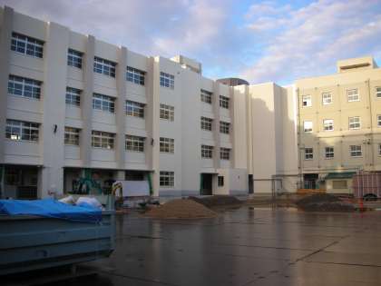 東から見た新校舎(左側)です。西館ととても調和が取れています。