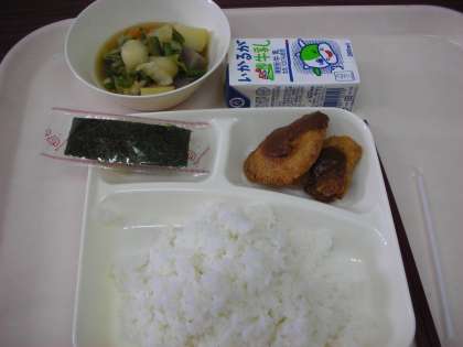 今日は、味噌カツ、ジャガイモと野菜の煮物、ご飯、牛乳、そして焼き海苔が添えられています。