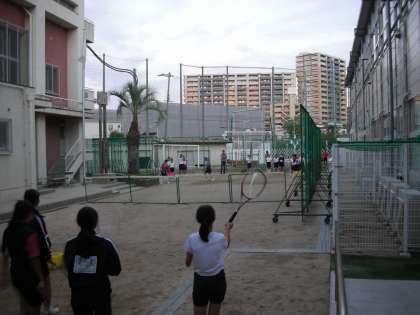 校内のグラウンドで、ソフトテニス部が練習をしています。