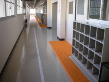 教室前の廊下です。廊下はピカピカです。オレンジ色のすのこの部分で、上靴に履き替えます。上靴は、体育館シューズを利用します。靴は、下駄箱に収納します。