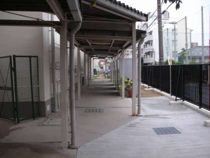 体育館前から見た西館の裏側です。 廊下のトンネルのようですね。