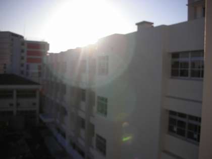 上は西校舎4階から見た新校舎です。新校舎の上に朝日が輝いています。