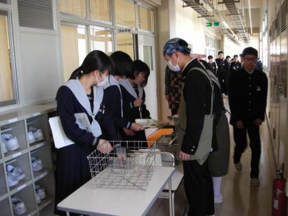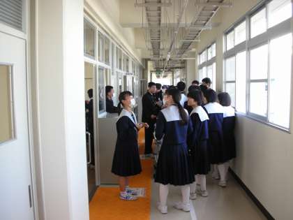 教室の廊下側で当番の人が給食を配っています。受け取る人は、教室側で上靴のままでもらっています。