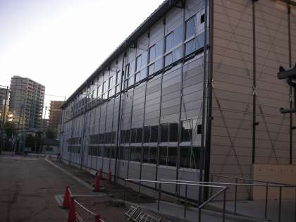 写真は、解体が始まった仮設校舎です。空調の室外機や換気扇が外されています。仮設校舎に設置されている附属品から取り外されているようです。