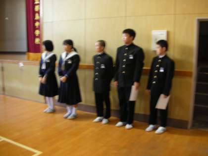 この日は、前期と後期の生徒会役員が全校生徒の前に立っています。