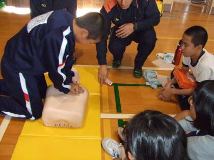 次に23年生にはその胸骨圧迫(心臓マッサージ)の方法とAEDの使い方を、人形を使って行い、また三角巾を使った初期手当の方法も教えていただきました。