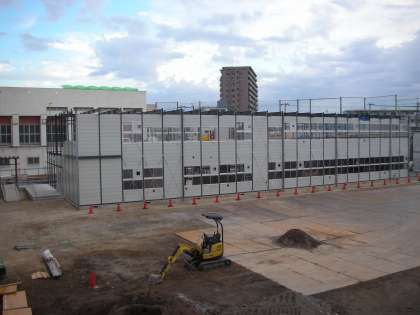 上の2枚は、体育館横から見たものです。仮設校舎の北側の屋根や壁がすでになくなっています。