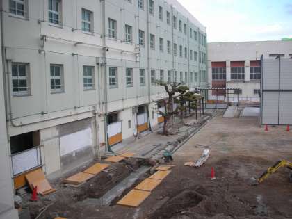 旧放送室前では、側溝の工事が行われています。