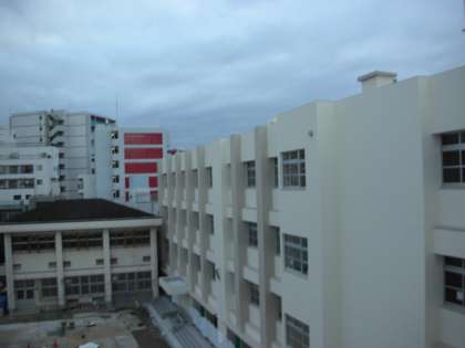 今日は、曇り空です。晴れた日には、新校舎の窓ガラスが日光を反射させているのですが、今日は新校舎も曇って見えます。