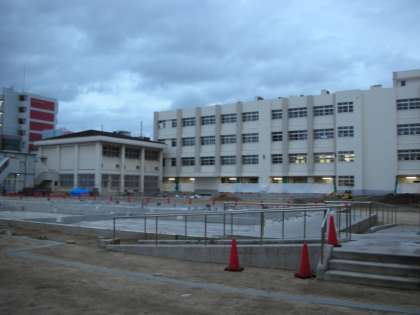 上の写真は、昨日、雷ガード側から見たものです。仮設校舎の解体が進み、西校舎も新南校舎もはっきりと見渡せるようになりました。
