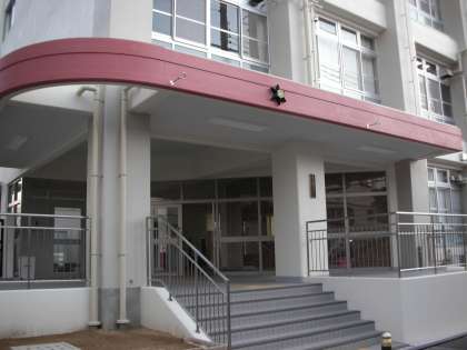 下は、正門玄関の写真です。冬の朝日が窓ガラスで反射しています。