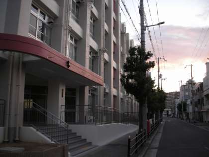 正門玄関の朝の様子です。 新校舎が街並みに溶け込んできた感じがします。