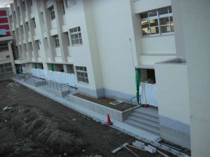 上は、西校舎2階から見た新校舎の1階部分です。新校舎からグラウンドに出るところに、階段とスロープが設置されています。
