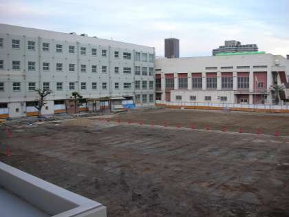 下は、新校舎2階から見たものです。左側に西校舎、右側に体育館が見えます。仮設校舎が建っていたところは、きれいに整地されています。