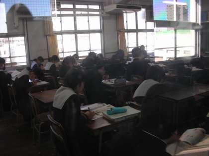 2年3組は、社会の授業です。先生のお話をノートにまとめています。